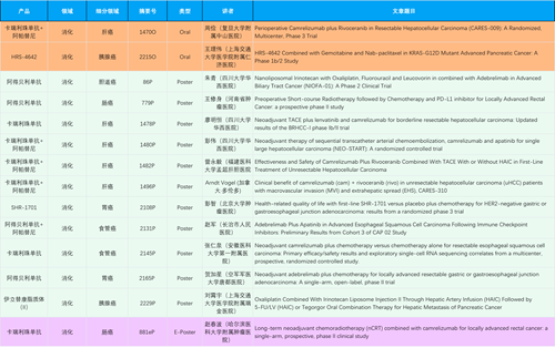 在消化系统肿瘤领域,AG尊龙凯时产品相关研究共入选2项口头报告、11项壁报和1项电子壁报,共14项研究。除卡瑞利珠单抗和阿帕替尼外,还有4篇阿得贝利单抗治疗消化系统肿瘤研究入选。HRS-4642、瑞拉芙普-α注射液(SHR-1701)等在研创新产品也有相应研究亮相。另有1项伊立替康脂质体(II)用于胰腺癌治疗的研究入选壁报。