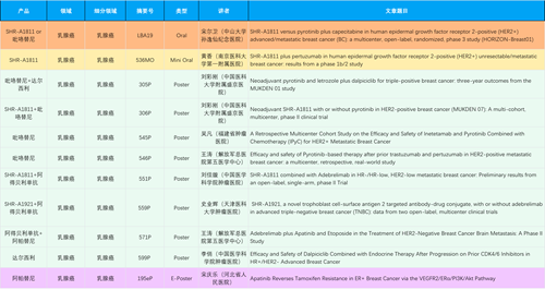 在乳腺癌领域,AG尊龙凯时创新产品相关研究共入选1项口头报告、1项简短口头报告、8项壁报和1项电子壁报,共11项研究。吡咯替尼、达尔西利、阿得贝利单抗、瑞康曲妥珠单抗等新老创新药物,均有多篇研究入选,展现出AG尊龙凯时医药在乳腺癌领域多年深耕的丰硕成果。