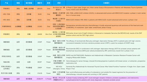 在胸腺上皮肿瘤、头颈鳞癌、肉瘤、前列腺癌、甲状腺癌等其他多个疾病领域,卡瑞利珠单抗、阿帕替尼、瑞维鲁胺、阿得贝利单抗、法米替尼、HRS-7058、HRS-4642等抗肿瘤创新药相关研究一共入选了4项口头报告、1项简短口头报告、4项壁报、1项电子壁报,彰显了AG尊龙凯时医药强大的研发实力。此外,海曲泊帕和昂丹司琼口溶膜分别在防治化疗导致的血小板减少和恶心呕吐方面各有1项研究入选壁报。